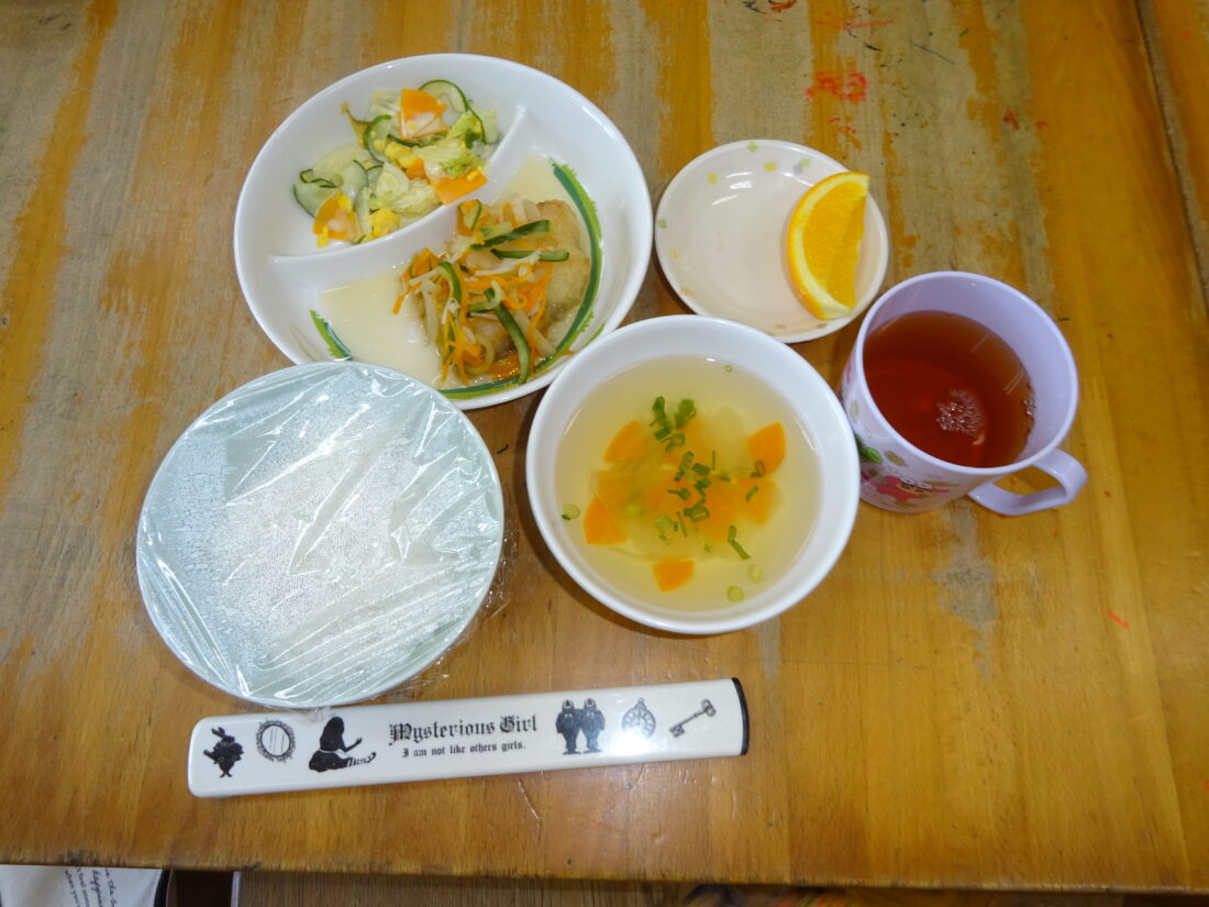 7/19の献立は、魚の南蛮漬け、春色サラダ、すまし汁、オレンジでした。