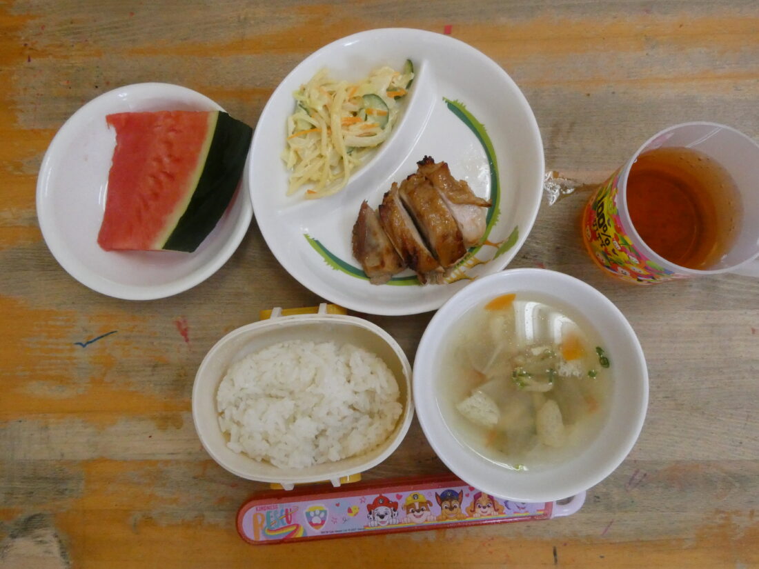8/4の献立は、鶏の照り焼き、スパゲティサラダ、田舎汁、スイカ(ひよこ組はオレンジ)でした。