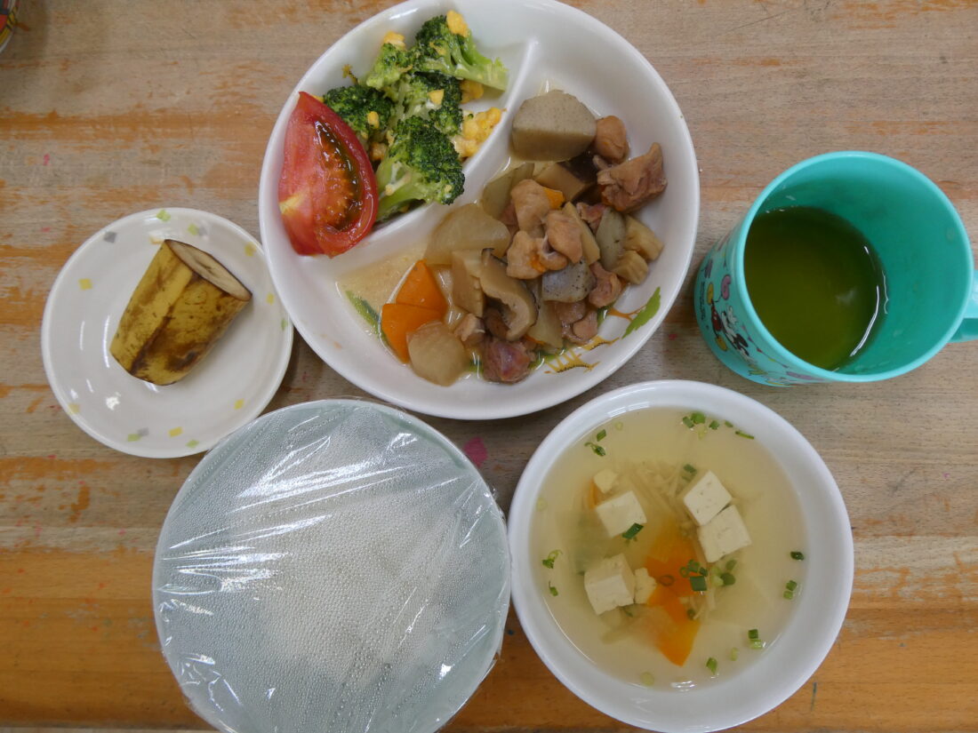 8/16の献立は、炒り鳥、ブロッコリーのサラダ、すまし汁、バナナでした。