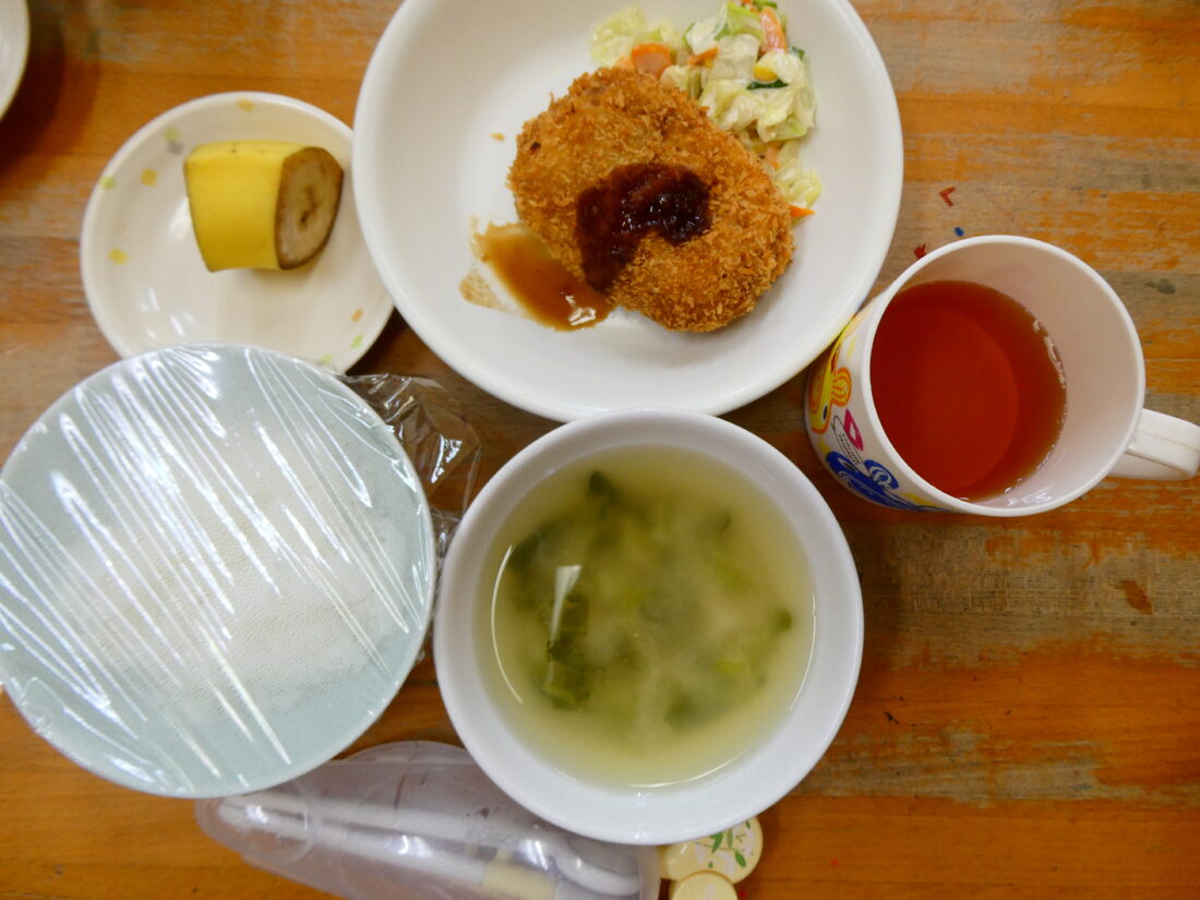 8/27の献立は、ポテトコロッケ、コールスローサラダ、呉汁、バナナでした。