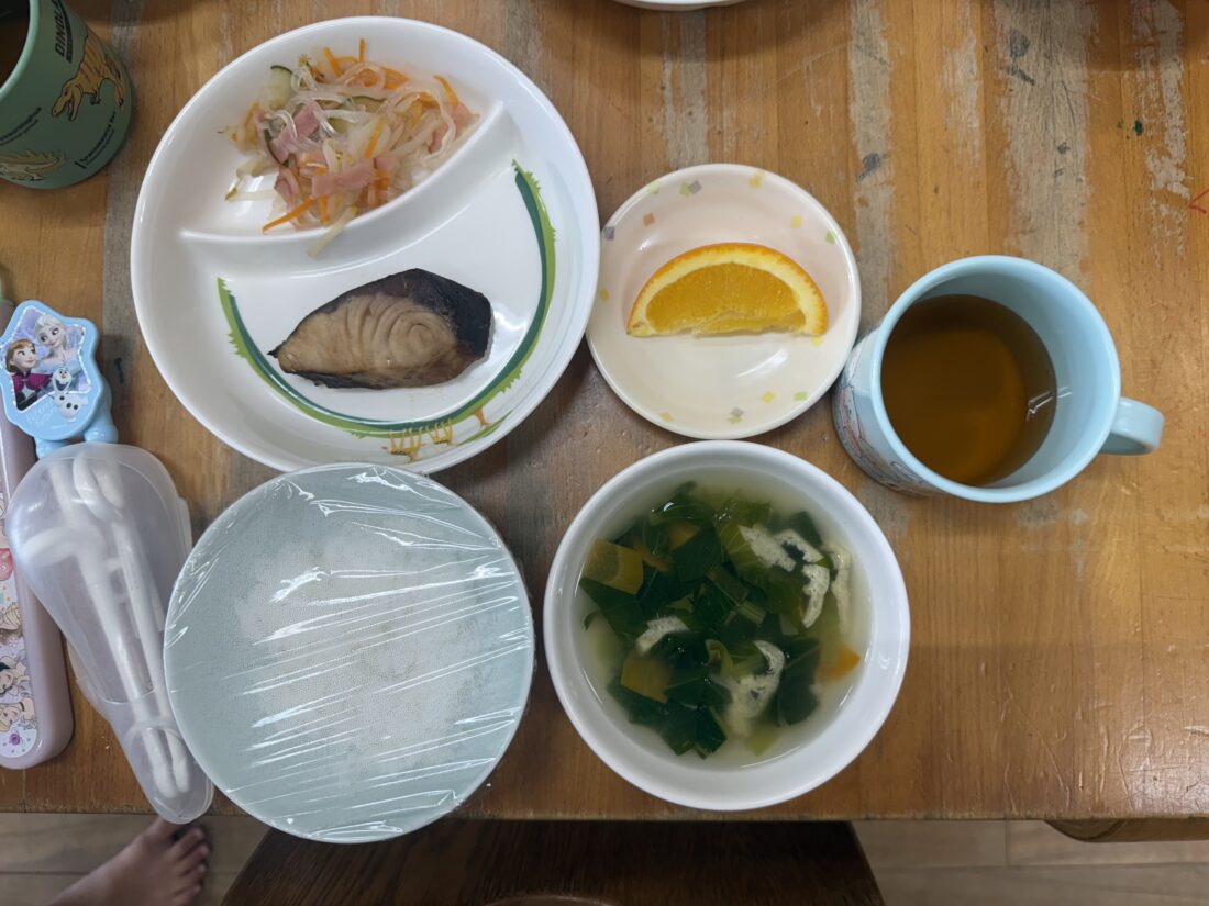 9/1の献立は、魚の照り焼き、春雨サラダ、すまし汁、オレンジでした。
