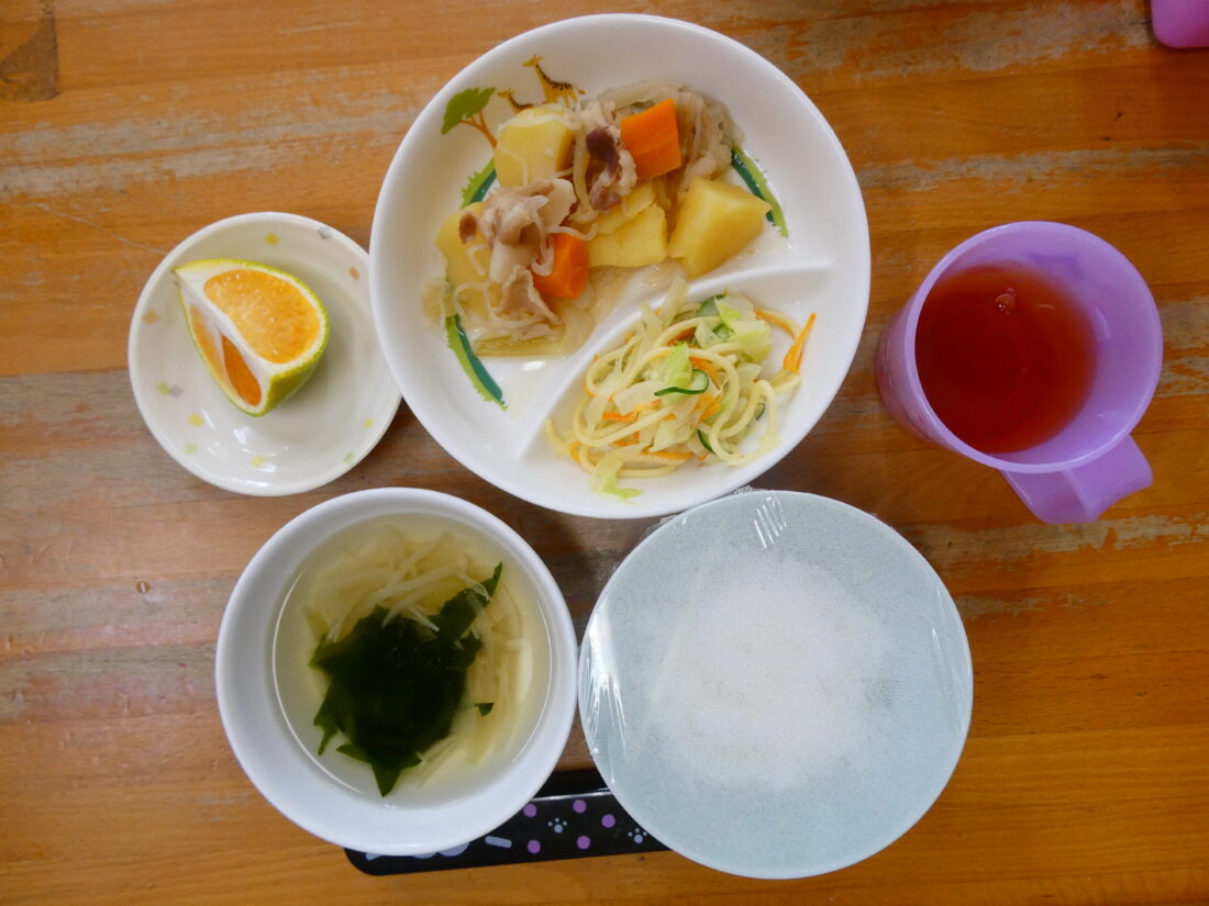 9/16の献立は、肉じゃが、スパゲティーサラダ、わかめスープ、みかんでした。