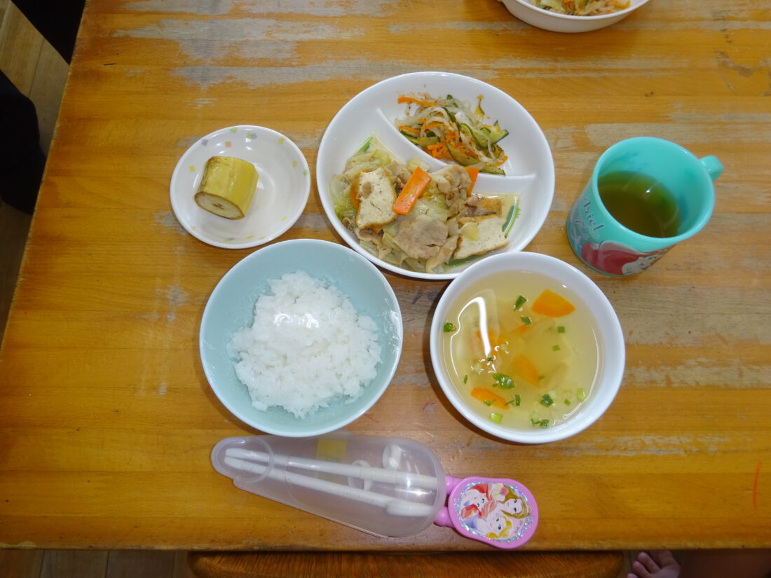 9/19の献立は、厚揚げと豚肉の炒め煮、大根サラダ、すまし汁、バナナでした。