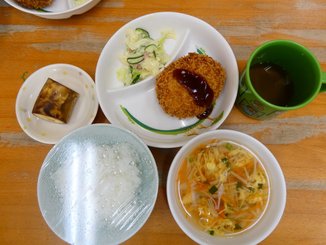 9/22の献立は、ポテトコロッケ、春色サラダ、カニ風味スープ、バナナでした。