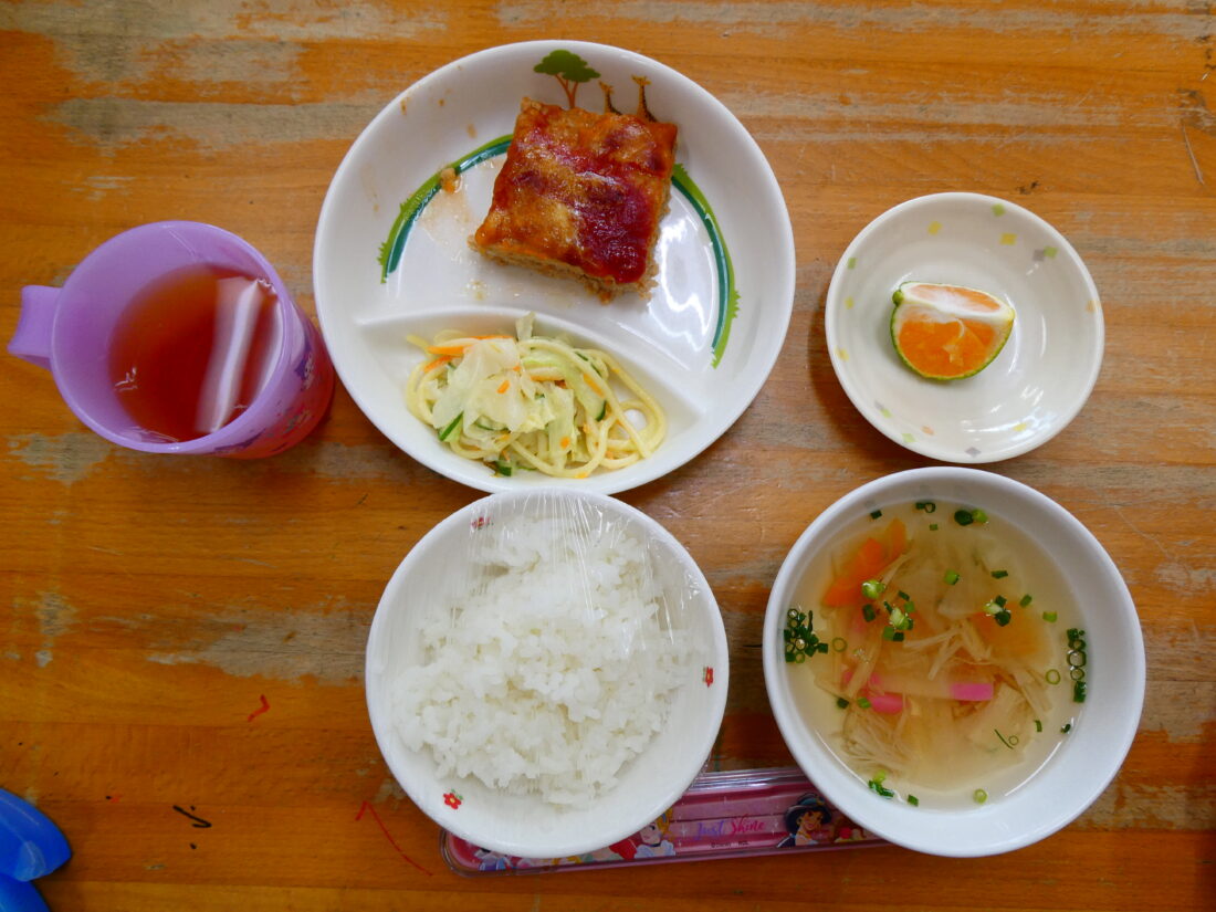 9/27の献立は、ピザバーグ、スパゲティサラダ、すまし汁、みかんでした。