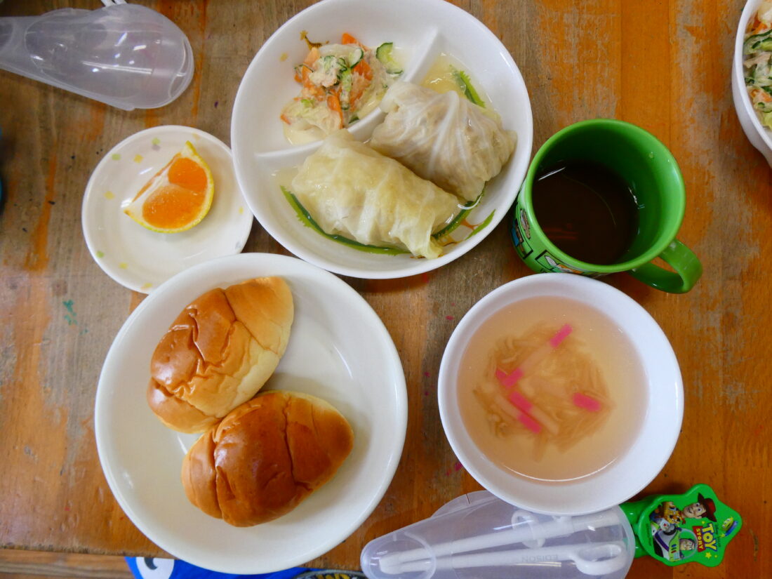 10/3の献立は、ロールパン、ロールキャベツ、シーチキンサラダ、コンソメスープ、みかんでした。