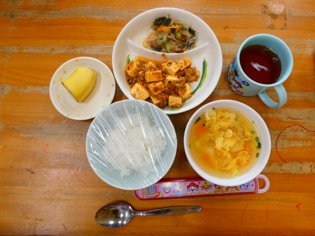 今日の献立は、マーボー豆腐、春雨サラダ、中華風スープ、バナナでした。