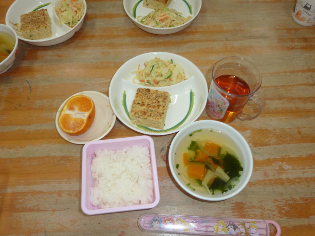 今日の献立は松風焼き、スパゲティサラダ、ワカメ汁、みかんでした。