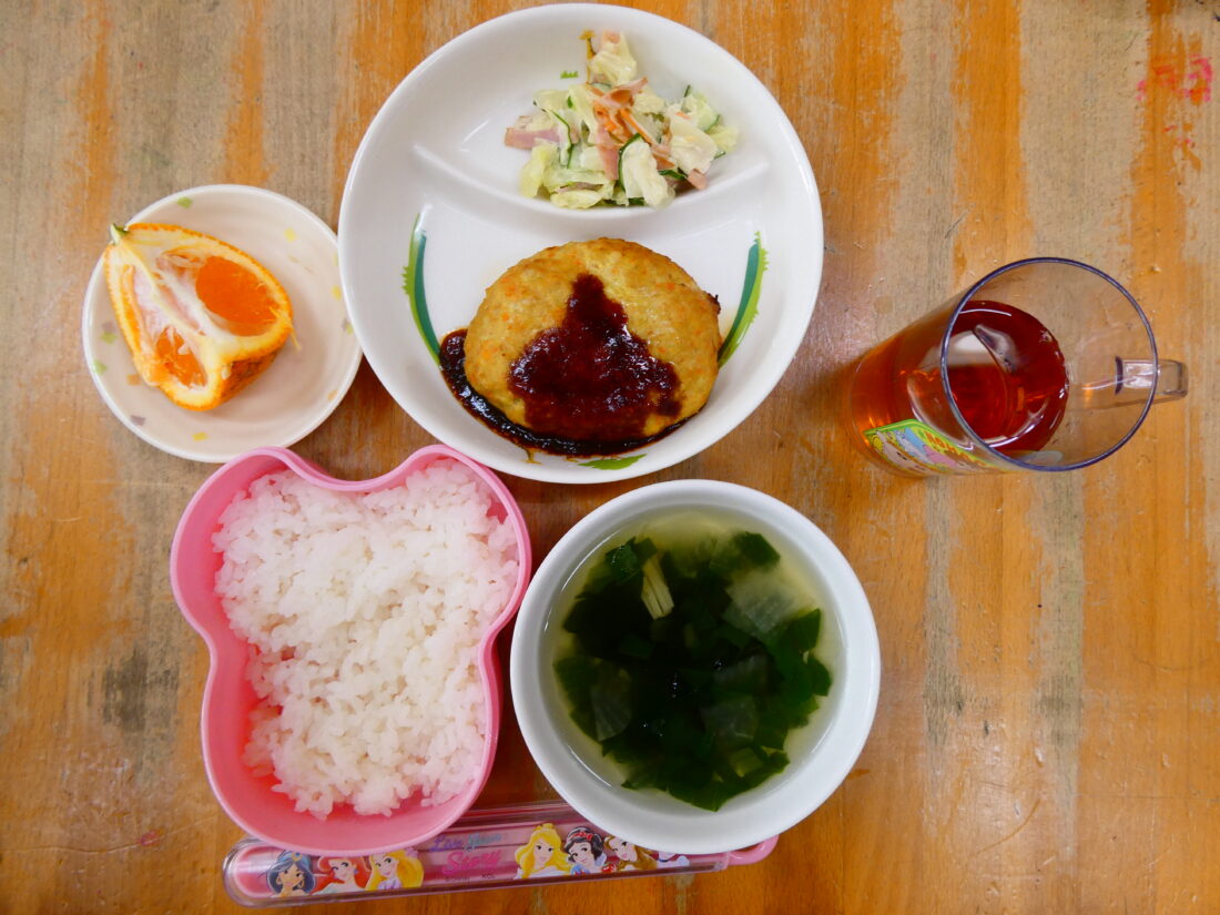 今日の献立は、ハンバーグ、春色サラダ、コンソメスープ、みかんでした。