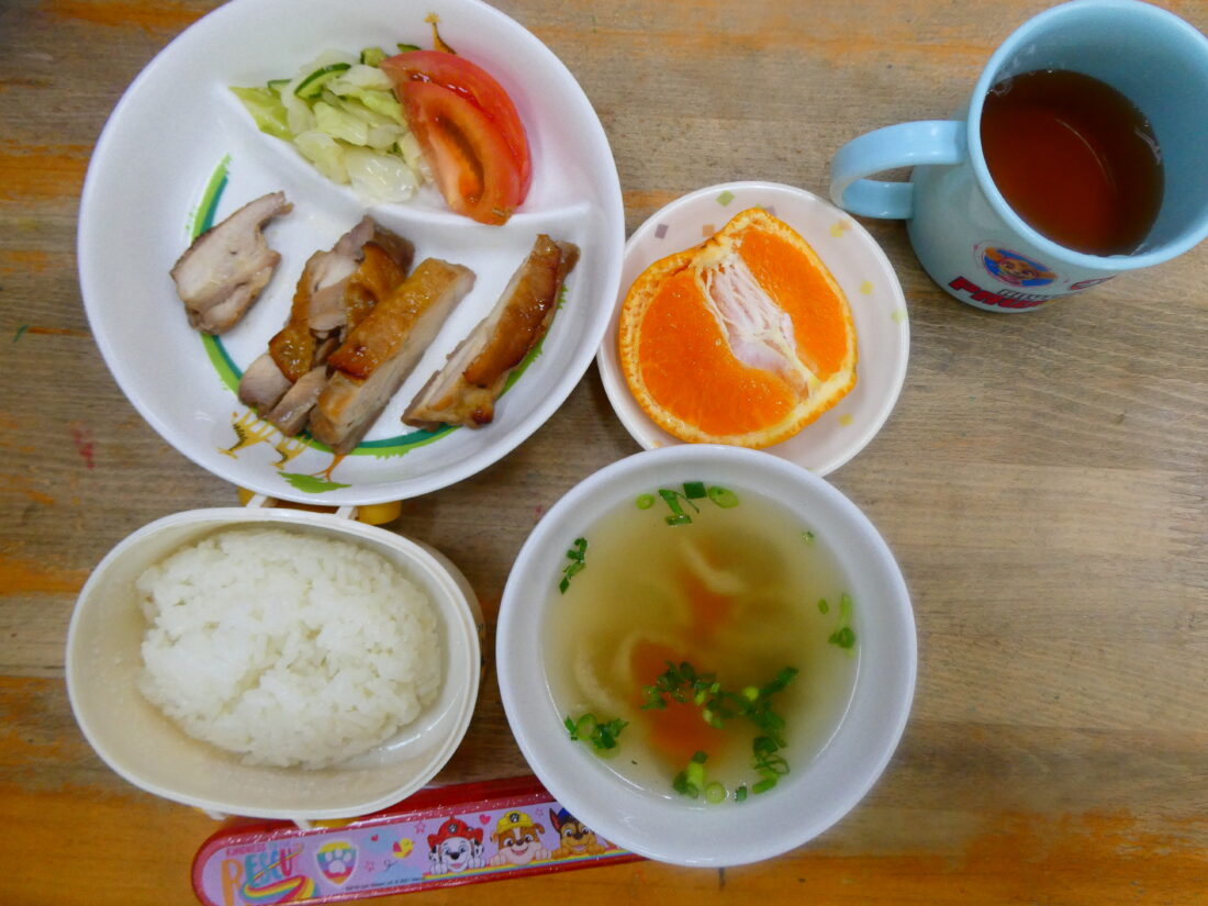 今日の献立は、鶏の照り焼き、野菜の付け合わせ(キャベツときゅうり、トマト)、田舎汁、みかんでした。