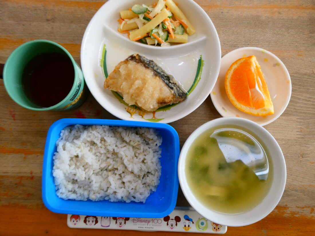 今日の献立は、揚げ魚のおろし煮、マカロニサラダ、小松菜の味噌汁、みかんでした。