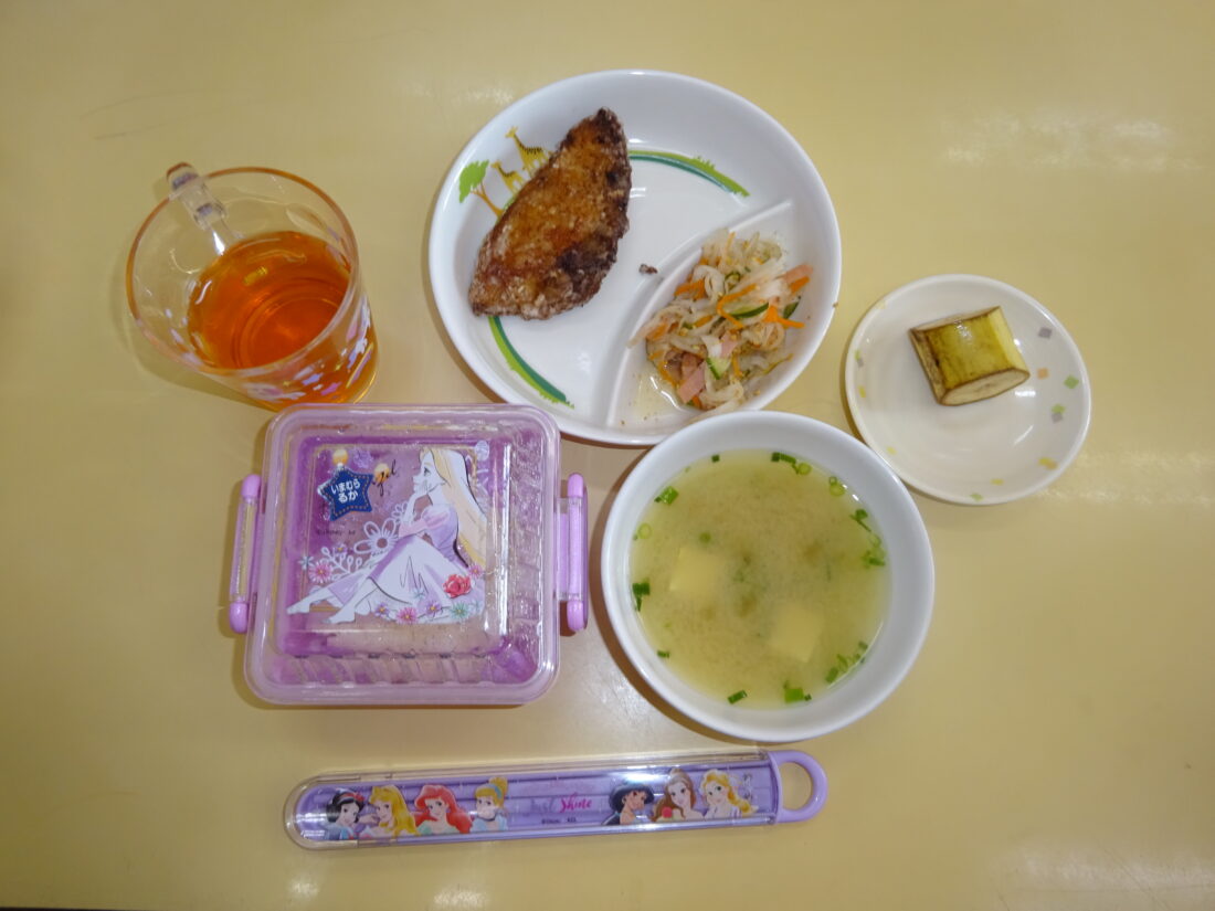 今日の献立は、魚の竜田揚げ、大根サラダ、田舎汁、バナナでした。
