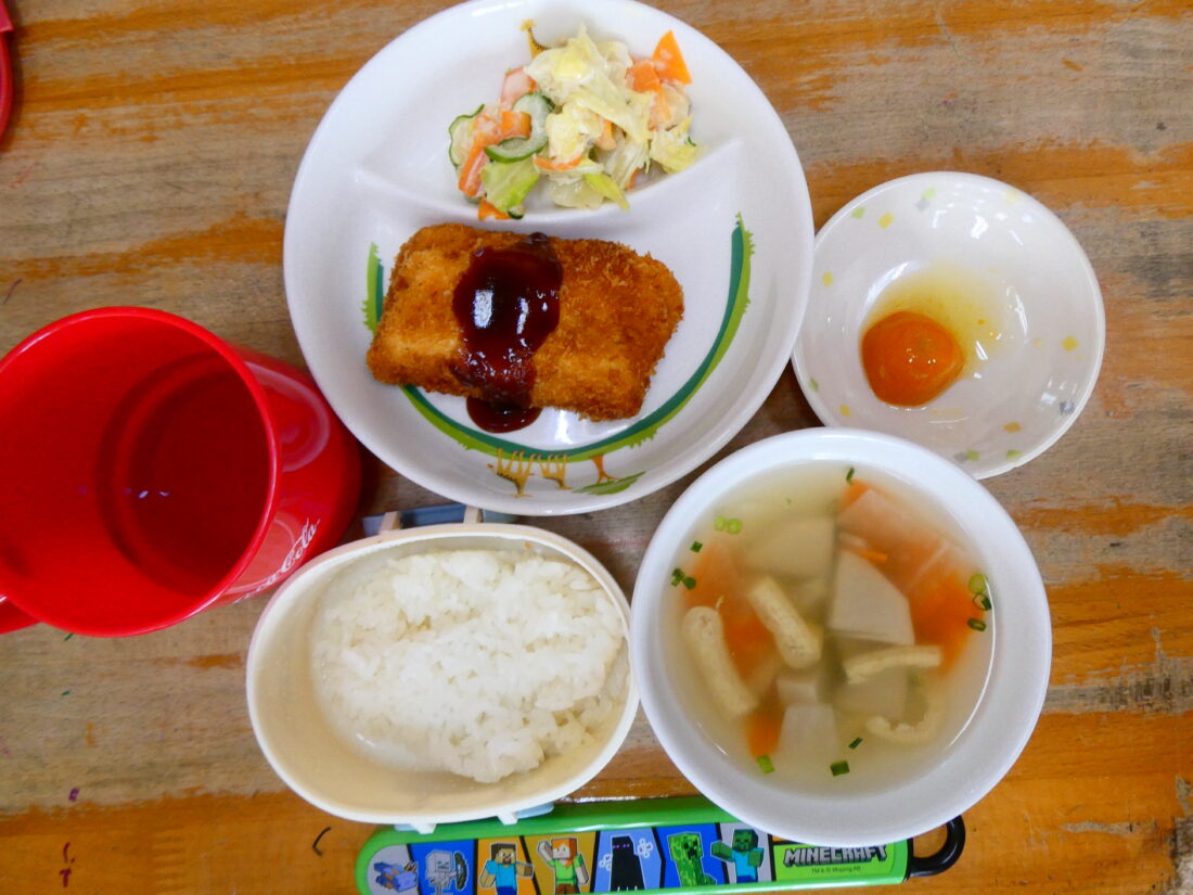 今日の献立は、魚のフライ、シーチキンサラダ、田舎汁、金柑でした。