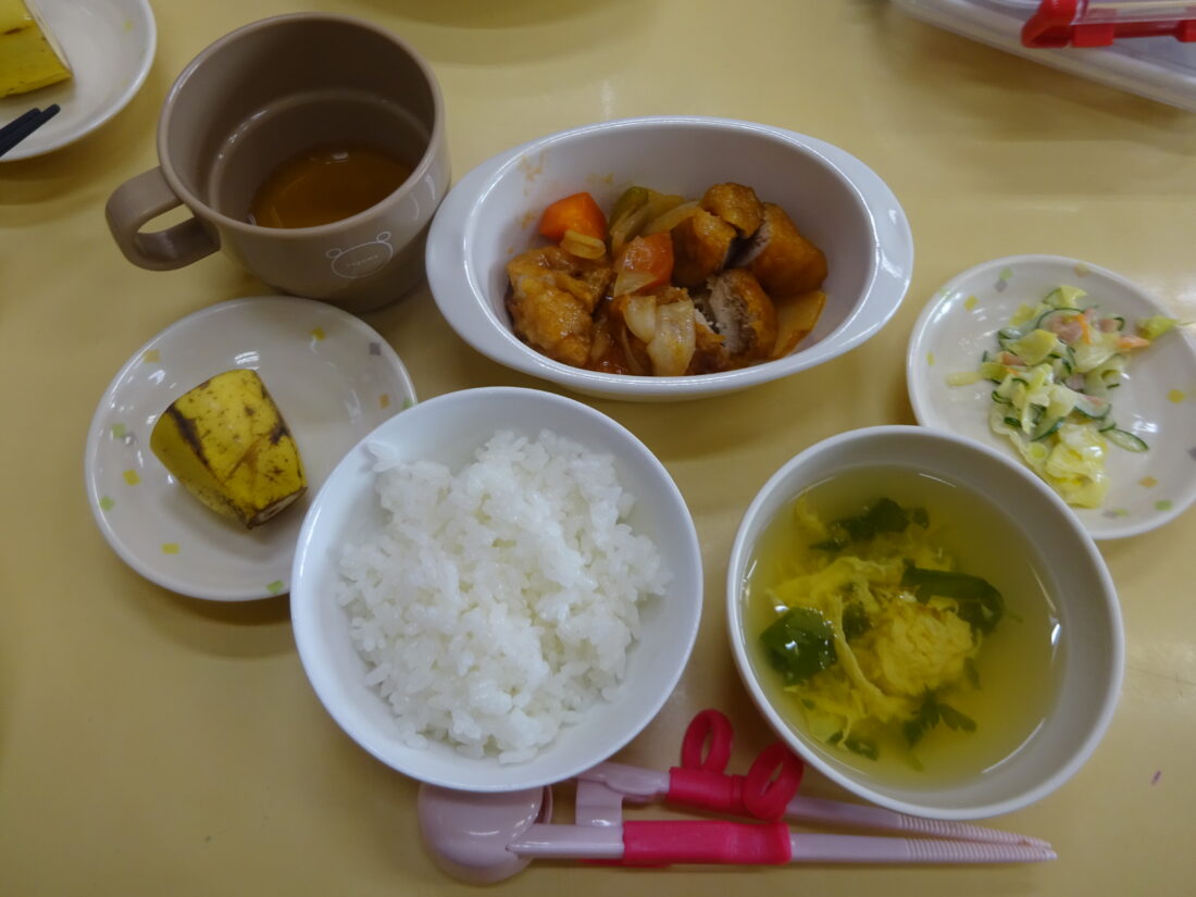 今日の献立は、鶏肉の南蛮漬け、春色サラダ、かきたま汁、バナナでした。