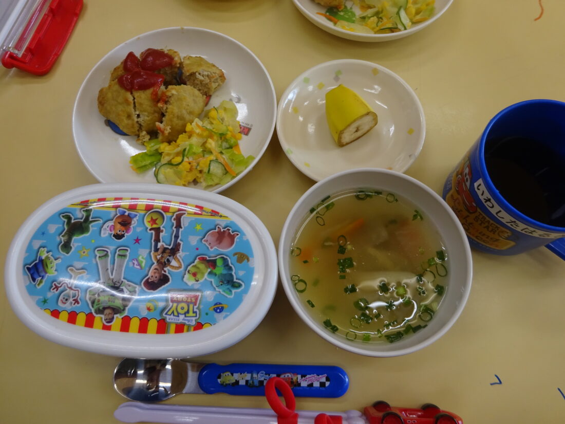 今日の献立は、ハンバーグ、春色サラダ、田舎汁、バナナでした。