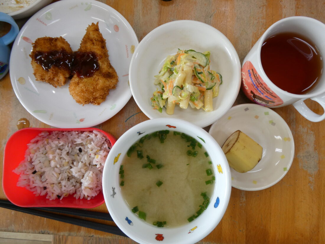 今日の献立は、魚のフライ、マカロニサラダ、なめこの味噌汁、バナナでした。