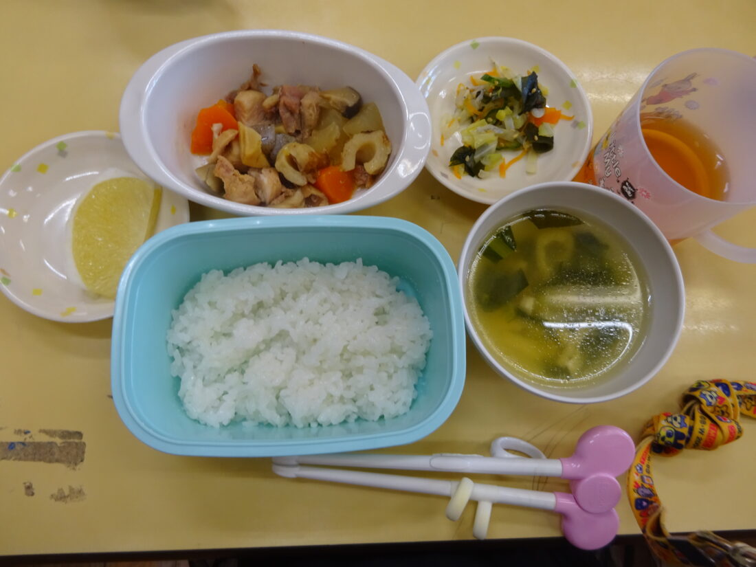 今日の献立は、筑前煮、しらす干しの酢の物、味噌汁、サワーポメロでした。