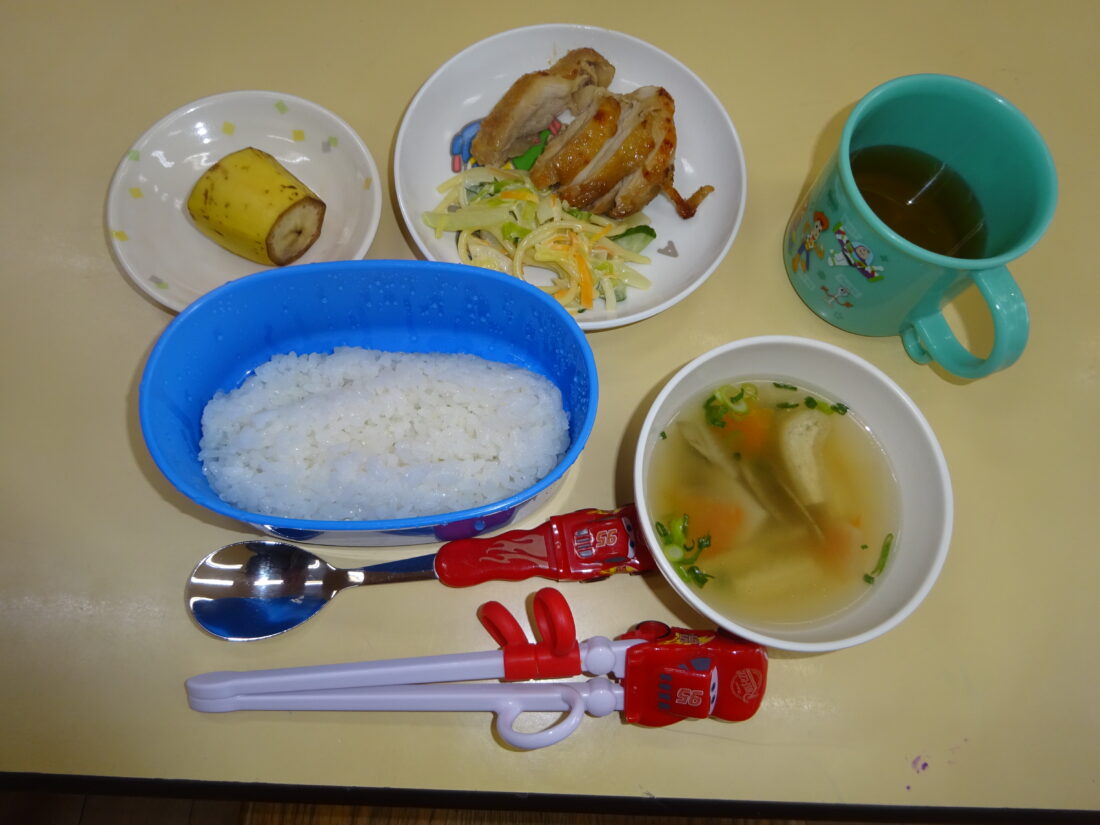 今日の献立は、鶏肉のみそ焼き、スパゲッティサラダ、田舎汁、バナナでした。