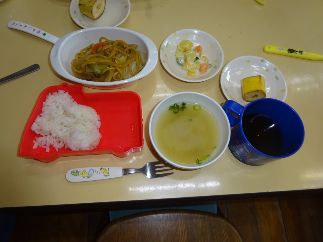 今日の献立は、焼きそば、マゼドアンサラダ、味噌汁、バナナでした。