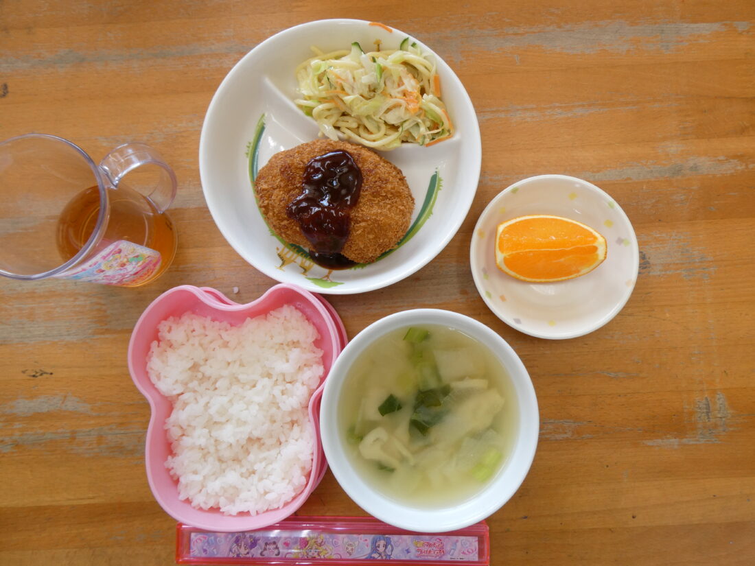 今日の献立は、ポテトコロッケ、スパゲティサラダ、小松菜の味噌汁、バナナでした。