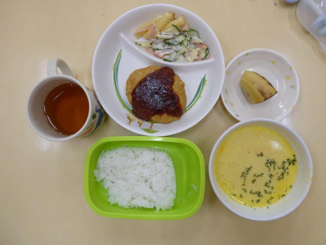 今日の献立は、ハンバーグ、マカロニサラダ、かぼちゃスープ、バナナでした。
