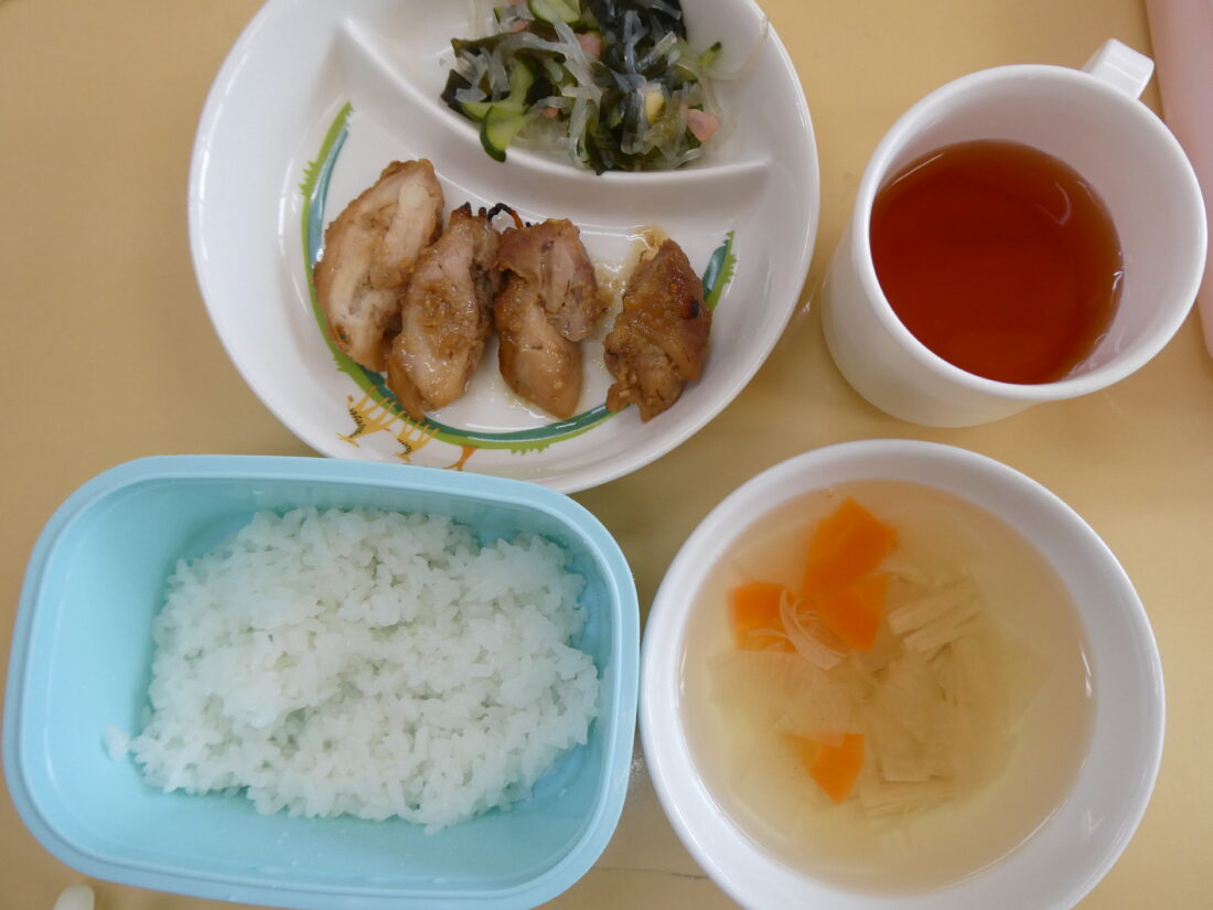 今日の献立は、鶏肉のごま味噌焼き、春雨サラダ、すまし汁、バナナでした。